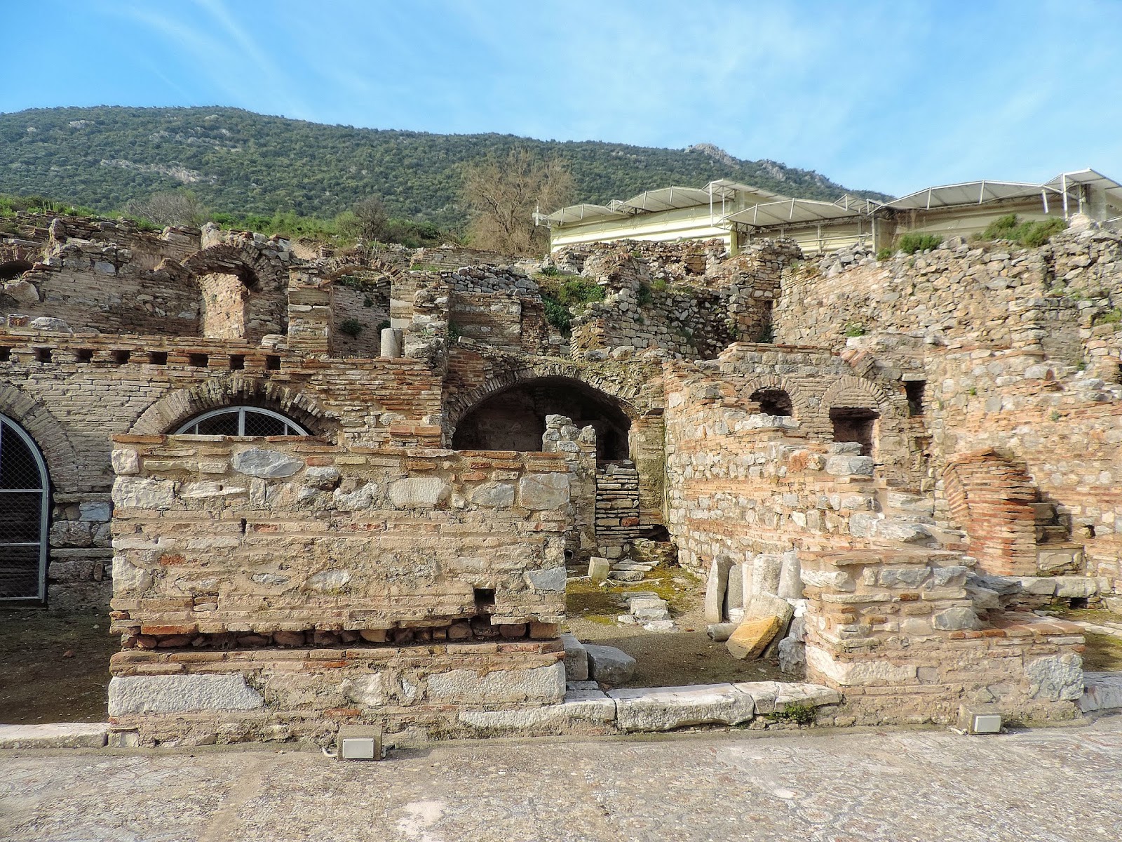 На снимката се виждат част от предпазните стени и покривът на ефеските стаи на терасите и част от портата на Адриан.